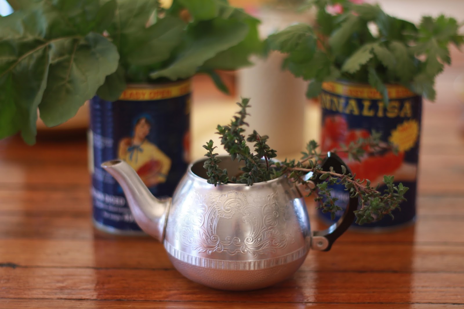 Home grown thyme in one of my favourite little teapots and rocket and coriander in recycled tomato tins.Β Β This little arrangement just made me smile.