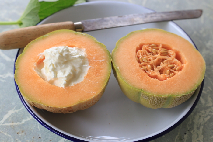 Rockmelon picked straight from the garden and filled with natural yoghurt makes such a simple, summery snack. The kids call these rockmelon bowls.