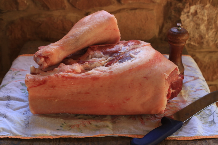 A gifted leg of pork that weighed in at around 9 kilograms. This pig was raised by hand, fed and cared for by a young family of willing helpers, slaughtered by skilled hands and finally deliver to us with care, by friends. No factory farming, no supermarket queues and no plastic wrapping, just real food and friendship.